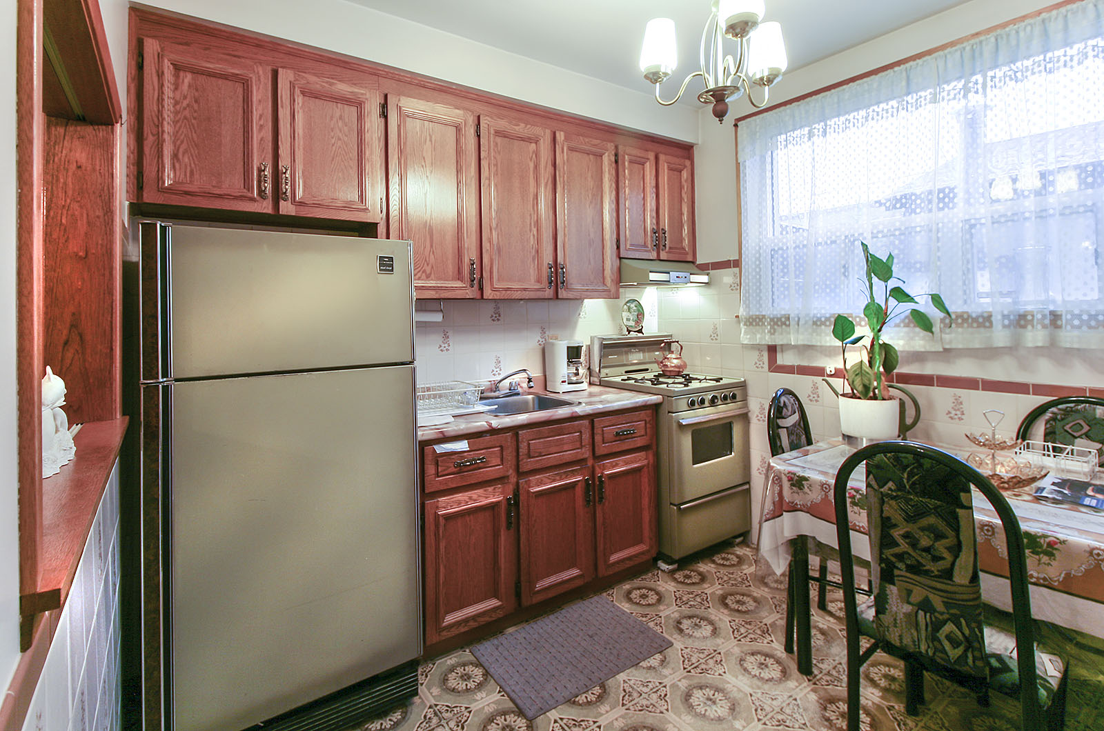 The brightly lit, eat-in kitchen comes equipped with a multitude of cabinet and counter space and appliances.